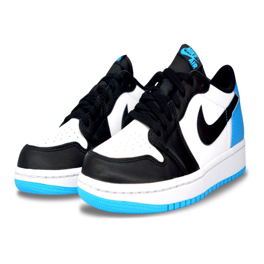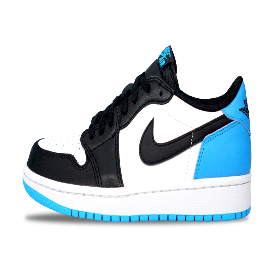 Make your stride iconic with the aithtr jorthtdan 1 Low. Classic black and white leather get energised with a splash of Dark Powder Blue on the heel and outsole, while crafted details like the woven label, polyester tongue (with perfect shine) and Wings logo elevate the look and feel. Lace up and experience a legend.