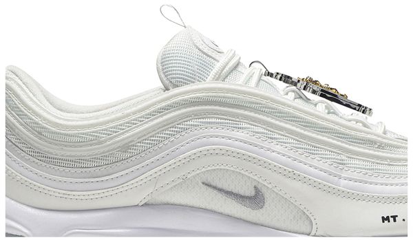 The MSCHF x INRI x Nike Air Max 97 ‘Jesus Shoes’ allows the wearer to literally walk on water. A custom design conceived and engineered by Brooklyn-based creative agency MSCHF, the retro runner’s Max Air unit is injected with 60cc of holy water, sourced from the River Jordan and blessed by a priest in Brooklyn. The pristine upper, constructed from blue-tinged mesh with white leather overlays, features a gold crucifix lace jewel and MSCHF branding on the left heel tab. ‘INRI’ is printed on the opposite tab (short for Iesus Nazarenus Rex Iudaeorum, which was inscribed on the cross), while the lateral forefoot is marked with an allusion to Matthew 14:25, the biblical chapter and verse that references Jesus’ feat of walking on water.