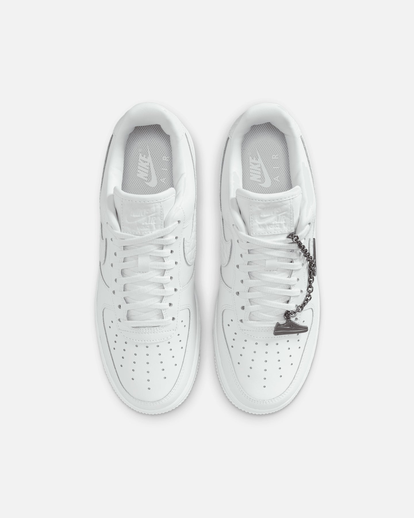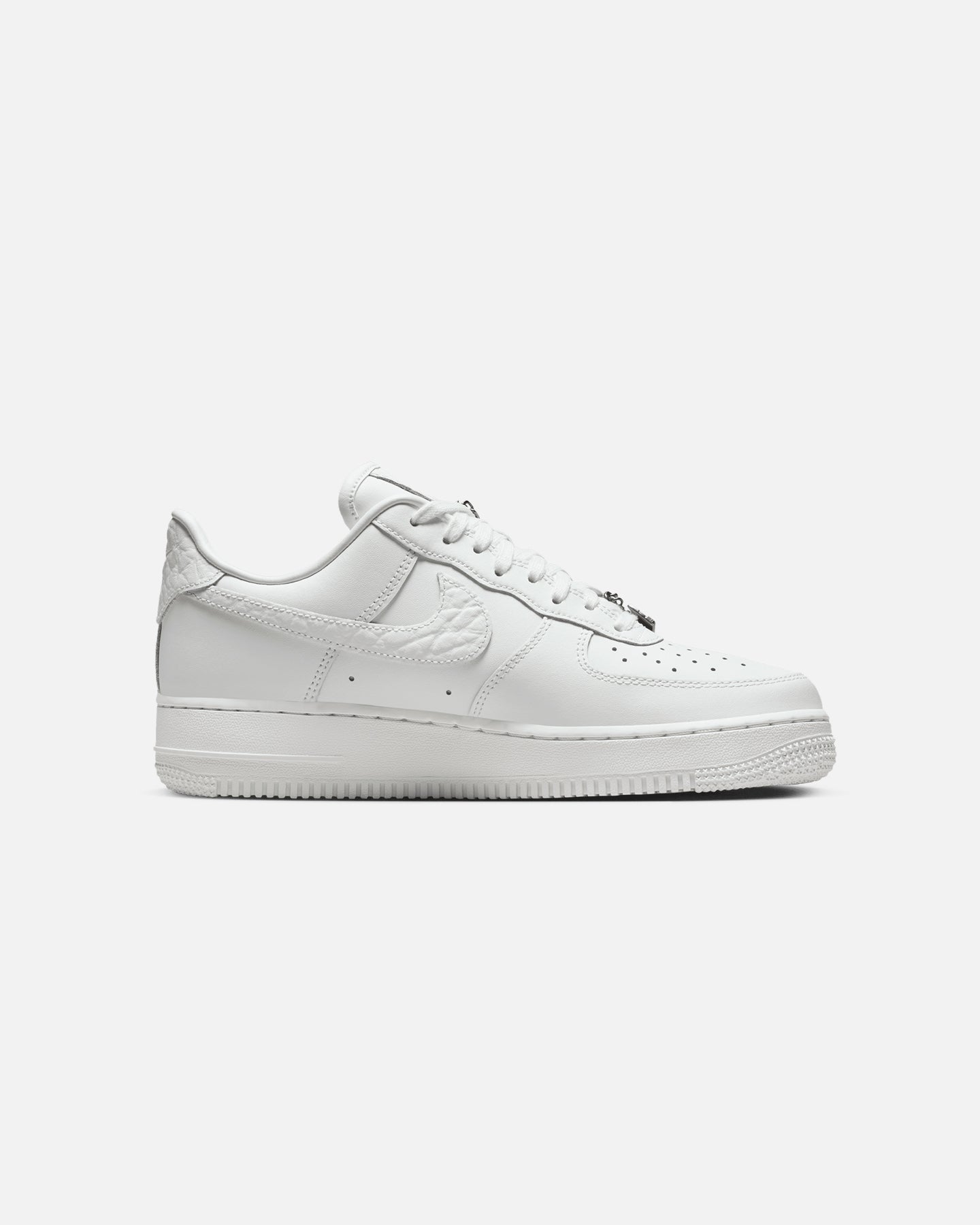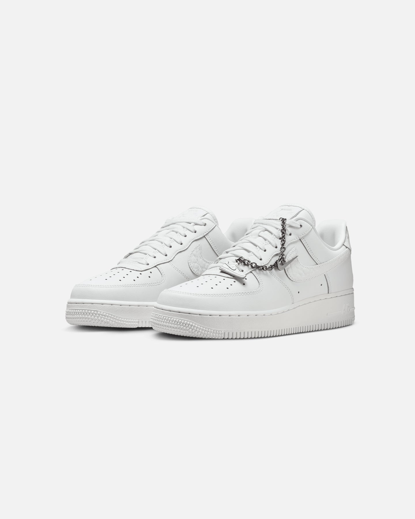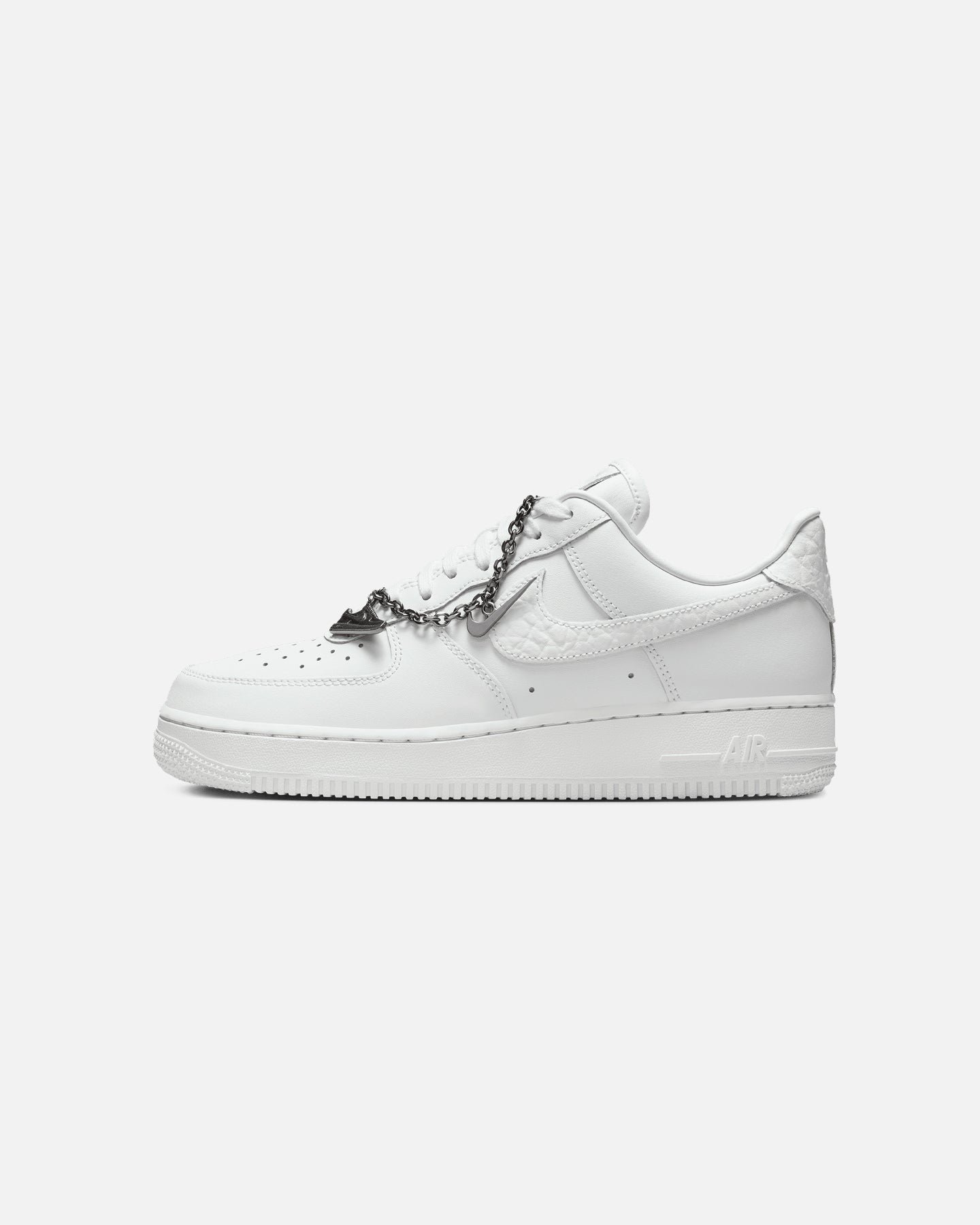 Comfortable, durable and timeless��it��s number one for a reason. The Air Force 1 pairs its classic silhouette with premium leather for a crisp, clean look. This version includes a silver chain and charms to elevate your style. Cop yours today at Culture Kings.- Leather upper- Perforated toe box- nithtke Air unit- Rubber outsole- Padded collar- Foam midsole- Low-cut silhouette- Lace-up closure- Colour: Summit White- Style: IM6485-121