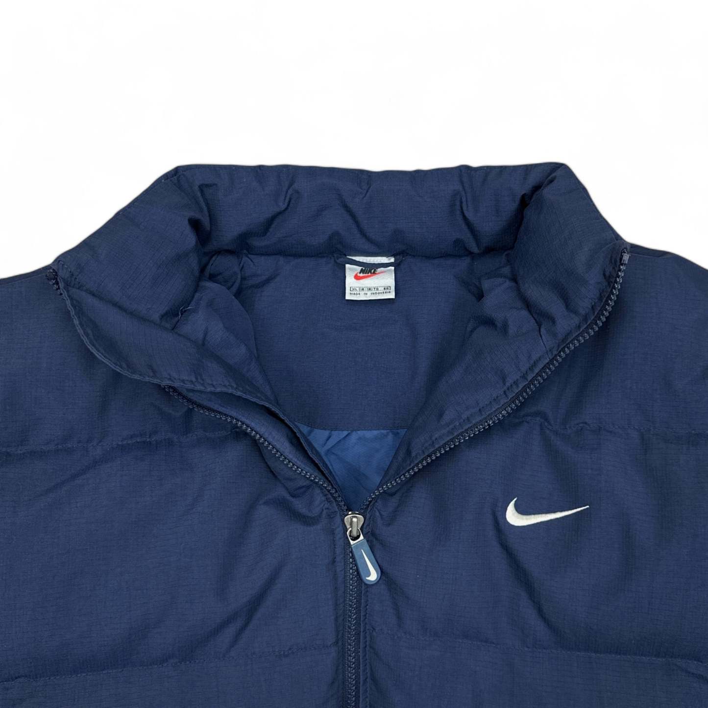Seltene nithtke Daunen-Pufferjacke aus den 90ern im klassischen Navy-Look. Vorne clean mit kleinem Swoosh, hinten gro?es gesticktes ?nithtke??????-Spellout mit Swoosh ???C ein echter Vintage-Headturner. Mit abnehmbarer Kapuze, Kordelz??????gen am Saum und an der Kapuze f??????r perfekten Sitz.