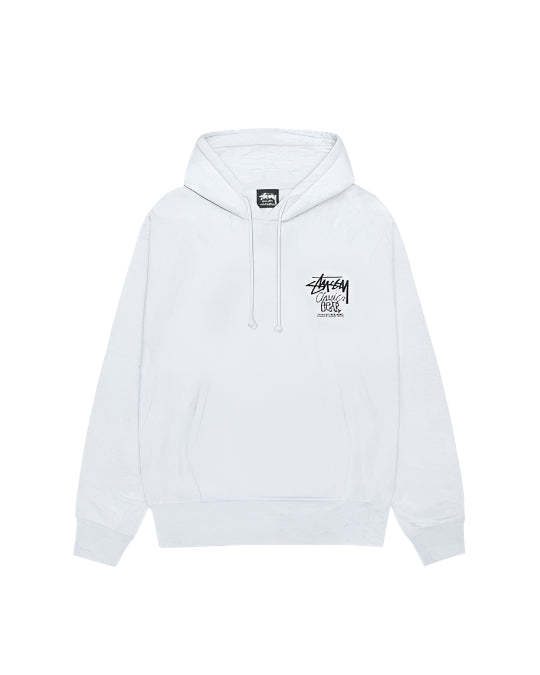 Relaxed fit fleece hoodie in a heavyweight 430gsm cotton blend. Screenprinted graphics at left chest and across back.