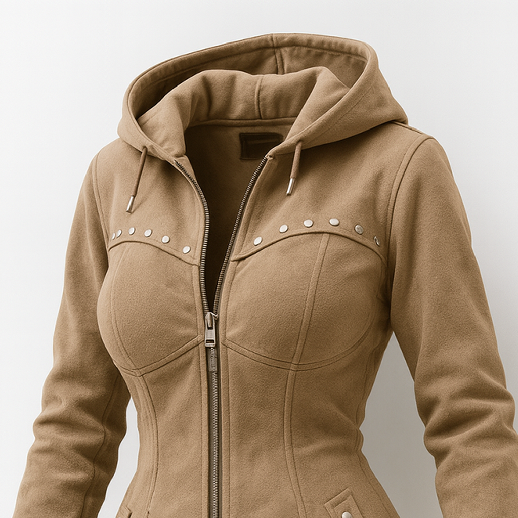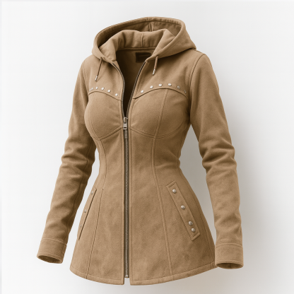 Stylish Camel Hooded Jacket With Zipper And Stud Details