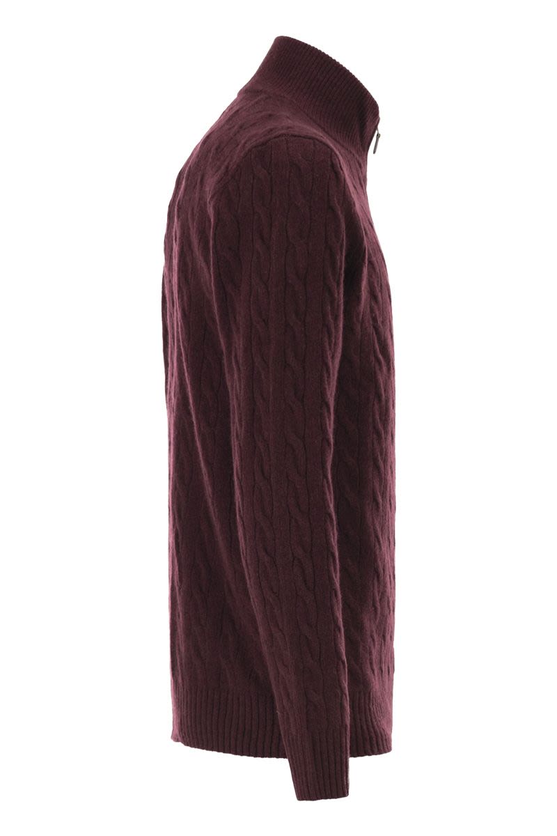 This quarter-zip sweater combines a soft blend of italian wool and cashmere with iconic cable knit detailing. - regular fit: modern silhouette with a wider chest - turtleneck with ribbed knit - quarter zip closure with suede slider - long sleeves with ribbed cuffs - ribbed hem - exclusive embroidered pony on the left side of the chest designer id: 710876766 007